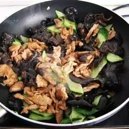10. 放入青椒后便倒入事先调好的鱼香酱汁调料翻炒片刻。