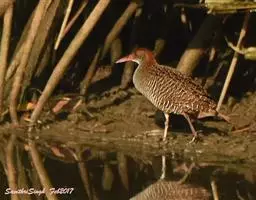 白眉田鸡是鹤形目秧鸡科的鸟类,小型涉禽,体长约20厘米。是一种灰褐色秧鸡。嘴短,头部斑纹明显,…