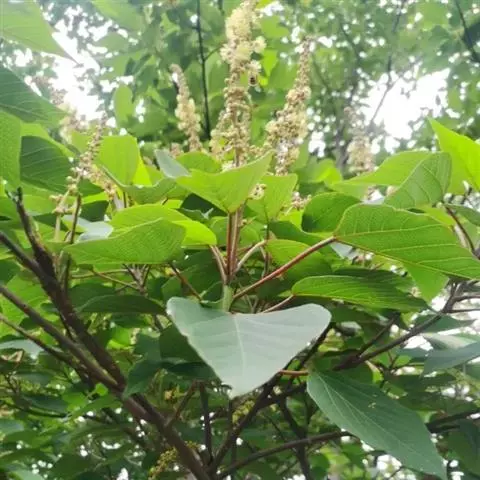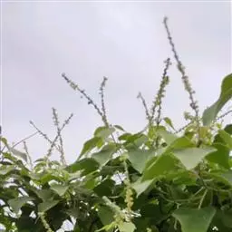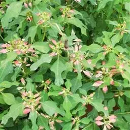 圆锥花序顶生或腋生,长5-8厘米,苞片条状披针形;花萼带紫红色且有白粉霜;雄花:花萼长约7毫米,裂片长卵形,近等大,长3-4毫米,宽2.5毫米,内面被毛;雄蕊长6-7毫米,花药顶部被白色短毛;雌花:花萼长约10毫米,裂片长圆状披针形,长约8毫米,宽约3毫米;子房卵形,具6条纵梭,柱头外弯,摺扇状。