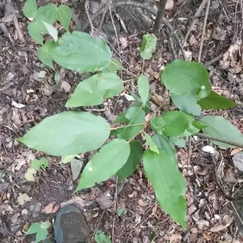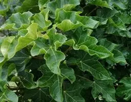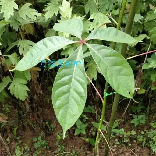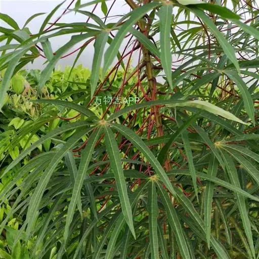 直立灌木,高1.5-3米;块根圆柱状。叶纸质,轮廓近圆形,长10-20厘米,掌状深裂几达基部,裂片3-7片,倒披针形至狭椭圆形,长8-18厘米,宽1.5-4厘米,顶端渐尖,全缘,侧脉(5-) 7-15条;叶柄长8-22厘米,稍盾状着生,具不明显细棱;托叶三角状披针形,长5-7毫米,全缘或具1-2条刚毛状细裂。