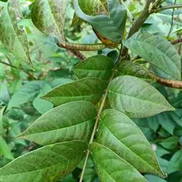 羽状三出复叶;托叶全缘,膜质,基部与叶柄相连,先端渐尖,被毛;叶柄平展,长6-12毫米;小叶长倒卵形、卵形至长圆状披针形,近等大,长15-40毫米,宽4-15毫米,先端钝,基部楔形,边缘上半部具三角形尖齿,上面无毛,下面疏被柔毛,或秃净,侧脉5-6对,不明显;顶生小叶具较长的小叶柄。