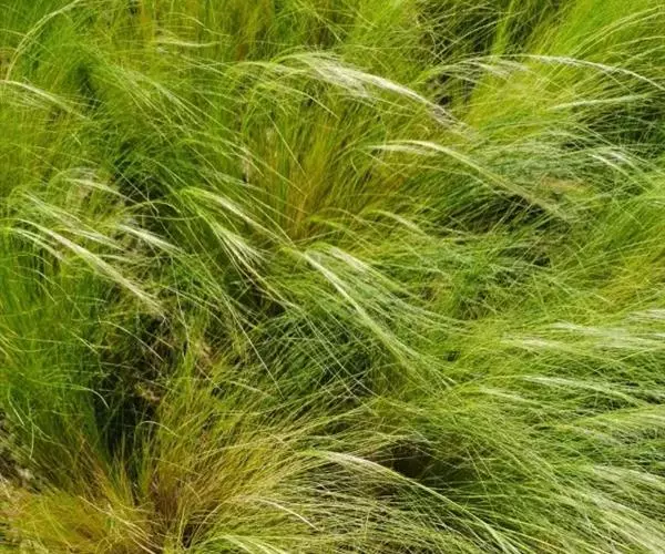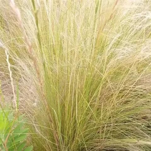 叶舌膜质,长4-8毫米;叶卷成细条形。圆锥花序狭窄,基部包于叶鞘内,长10-20厘米。小穗含1小花。颖狭披针形,先端纤细,长2.5-3.5厘米。外稃圆筒形,包卷内稃,长1-1.2厘米。基盘尖锐, 密生柔毛,芒二回膝曲,扭转,光滑, 第一芒柱长3.5-5厘米,第二芒柱长 1.2-2厘米,芒针卷曲成丝状,长 6-12厘米。