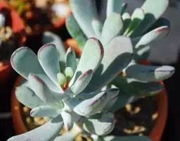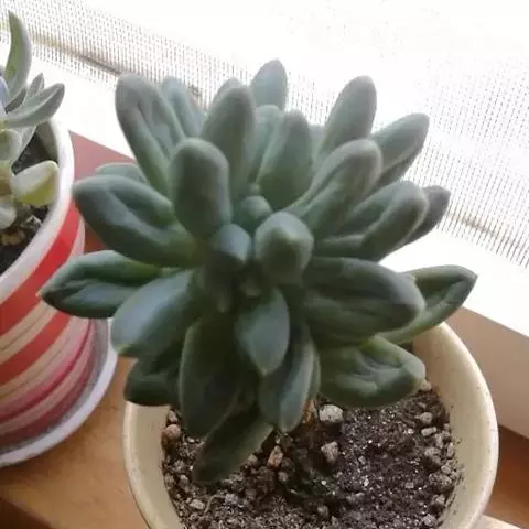 蓝黛莲是一种景天科厚叶草属植物。叶片呈略扁的圆柱形,排列成莲座状;颜色为灰绿色,…