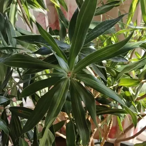 剑叶龙血树为长绿乔木状植物,茎高可达5-15米。茎粗大,分枝多,树皮灰白色,光滑,老干皮部灰褐色,片状剥落,幼枝有环状叶痕。叶聚生在茎、分枝或小枝顶端,互相套迭,剑形,薄革质,长50- 00厘米,宽2-5厘米,向基部略变窄而后扩大,抱茎,无柄。圆锥花序长40厘米以上,花序轴密生乳突状短柔毛,幼嫩时更甚;花每2-5朵簇生,乳白色;花梗长 3-6毫米,关节位于近顶端;花被片长6-8毫米,下部约1/4-1/5合生;花丝扁平,宽约0.6毫米,上部有红棕色疣点;花药长约1.2毫米;花柱细长。浆果直径约8-12毫米,桔黄色,具1-3颗种子。花期3月,果期7-8月。