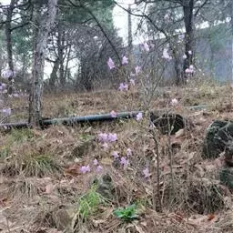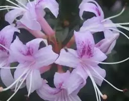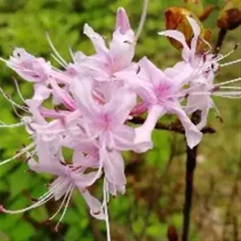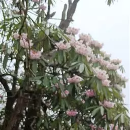 刺毛杜鹃(Rhododendron championiae Hook.):常绿灌木,高2-5米;枝褐色,被开展的腺头刚毛和短柔毛。叶厚纸质,长圆状披针形,上面深绿色,疏被短刚毛,下面苍白色,密被刚毛和短柔毛。伞形花序生枝顶叶腋,有花2-7朵;花冠白色或淡红色,狭漏斗状,长5-6厘米,稀达7.2厘米,5深裂,裂片长圆形或长圆状披针形。蒴果圆柱形,长达5.5厘米,微弯曲,具6条纵沟。花期4-5月,果期5-11月。