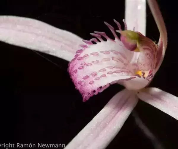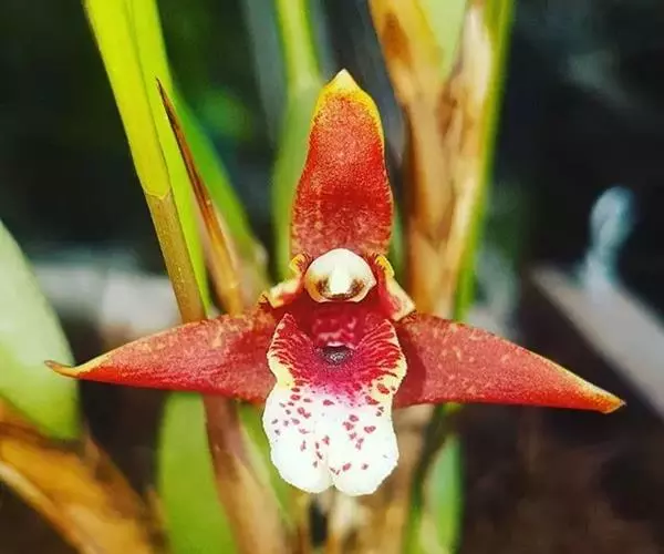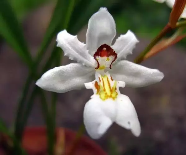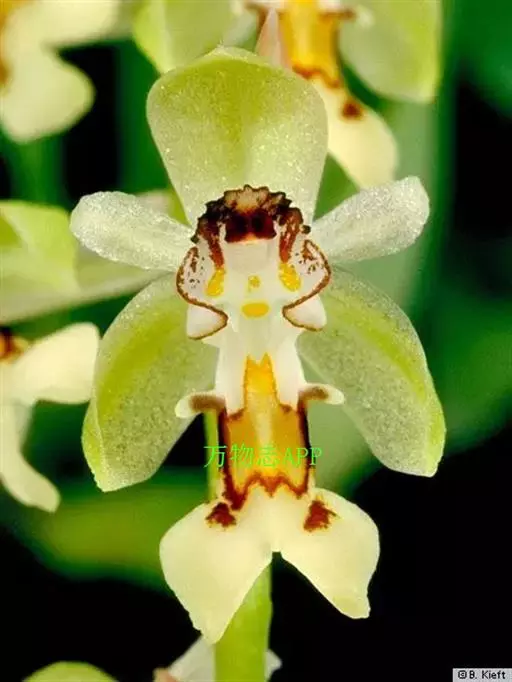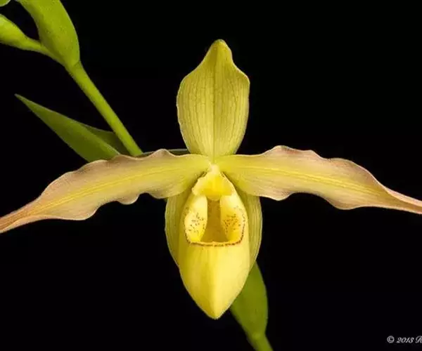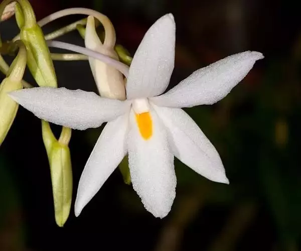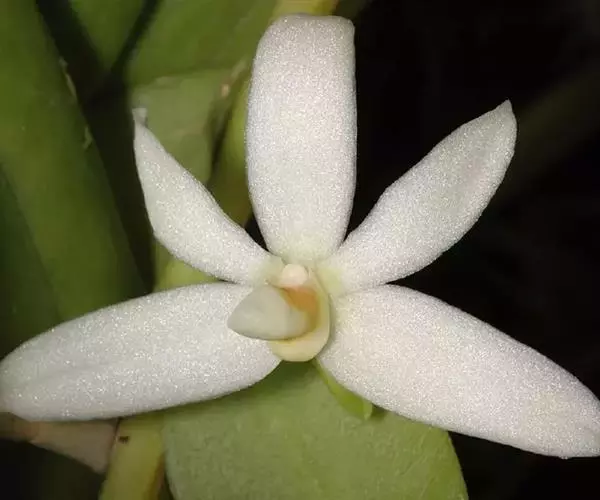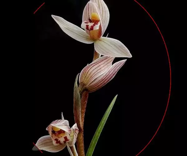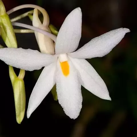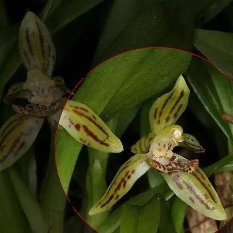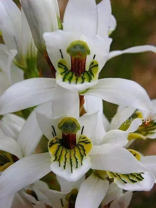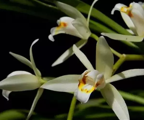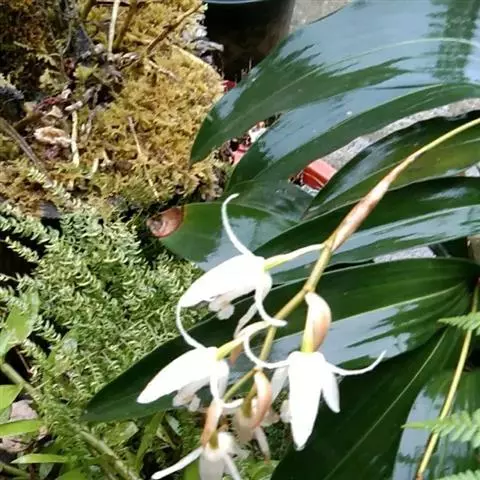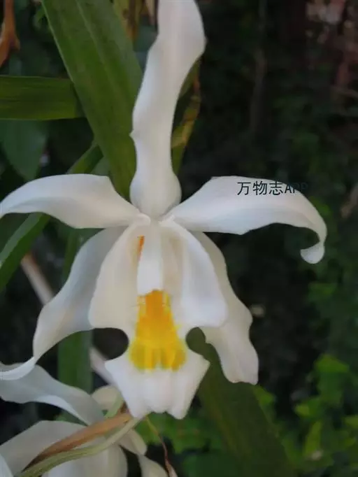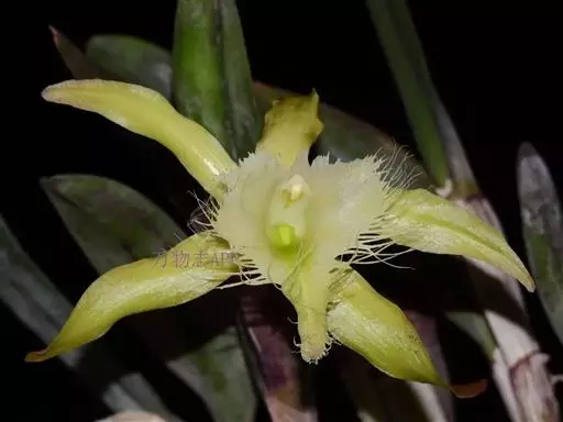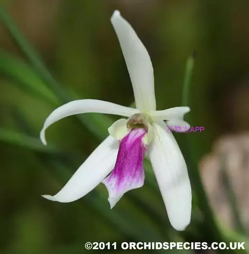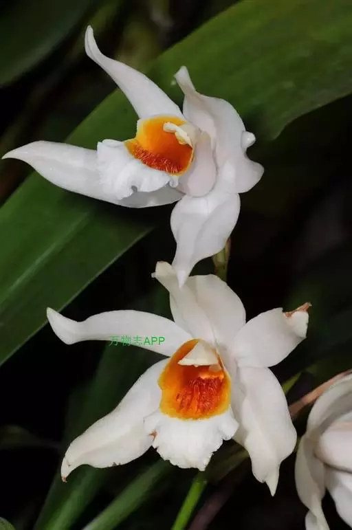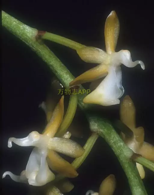 花葶连同幼嫩假鳞茎和叶从靠近老假鳞茎基部的根状茎上发出,长8-12厘米,下半部为鞘所包;总状花序长5-7厘米,具2-4朵花;花苞片卵状披针形,纸质,多少舟状,长2.5-3.5厘米,在花期不落;花梗和子房长2-2.5厘米;花白色,较大;萼片披针形或长圆状披针形,长3-4厘米,宽1-1.5厘米,先端急尖,背面多少具龙骨状突起。