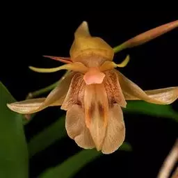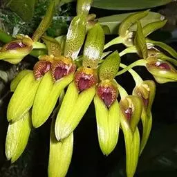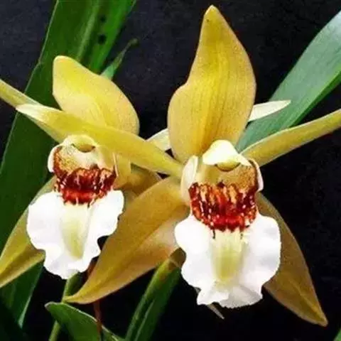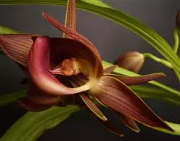 贝母兰根状茎较坚硬,多分枝,粗4-6毫米,密被有光泽的、革质的、鳞片状鞘。假鳞茎在根状茎上相距1.5-3厘米,长圆形或卵形,长(1-)2.5-6厘米,粗(0.5-)1-1.7厘米,干后皱缩而有深槽,顶端生2枚叶,基部具数枚鞘;鞘革质,卵形或卵状披针形,长2-6厘米。叶线状披针形,坚纸质,长(5-)10-17厘米,宽(4-)7-19毫米,先端长渐尖,基部渐狭,具不明显的短柄。