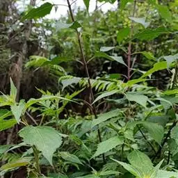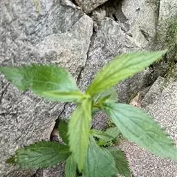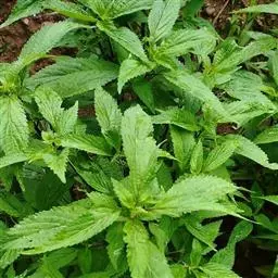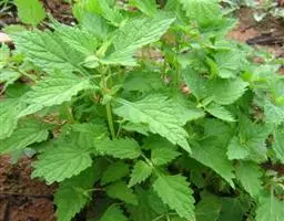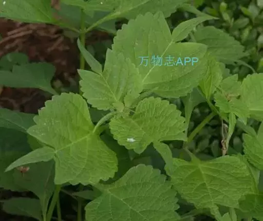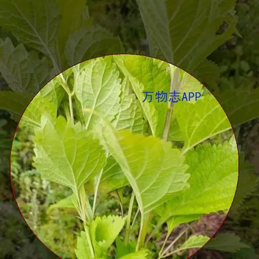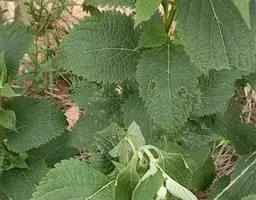 茎叶对生,圆形或圆状卵圆形,长(4)6-13厘米,宽3(4)-10厘米,先端具深凹,凹缺中有一尾状长尖的顶齿,顶齿长4-6厘米,基部渐狭至中肋,全缘或下部有1-2对粗锯齿,叶片基部宽楔形或近截形,骤然渐狭下延至叶柄,边缘在基部以上具粗大的牙齿状锯齿,齿尖具胼胝体,上面暗绿色,沿脉上密被微柔毛,余部散布糙伏毛伏小硬毛,下面淡绿色,沿脉上疏被微柔毛,余部无毛,散布淡黄色腺点,侧脉3-4对,两面隆起,平行细脉明显;叶柄长0.6-6厘米,向茎顶变短,腹凹背凸,疏被微柔毛,上部具翅。