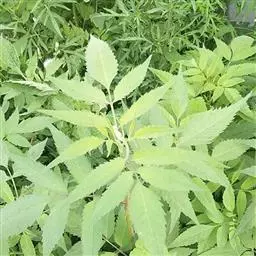 叶对生,无毛,叶柄有狭翅,椭圆形或长椭圆状披针形,边缘有锯齿。上部叶3深裂或不裂,茎顶部的叶小,有时不分裂;茎中、下部的叶片羽状分裂或深裂,裂片3~5,卵状披针形至狭披针形,边缘疏生不整齐大锯齿,顶端裂片通常比下方者大,叶柄有翼。