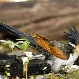 红翅凤头鹃:体长约38厘米,顶冠及凤头黑色,具显眼的直立凤头,背及尾黑色而带蓝色光泽,翅栗红色,…