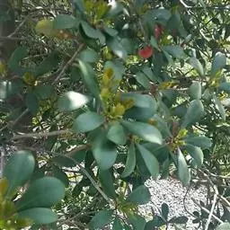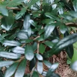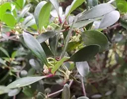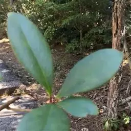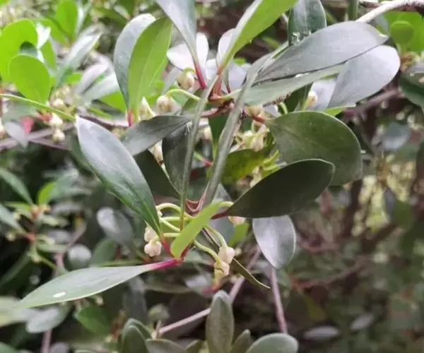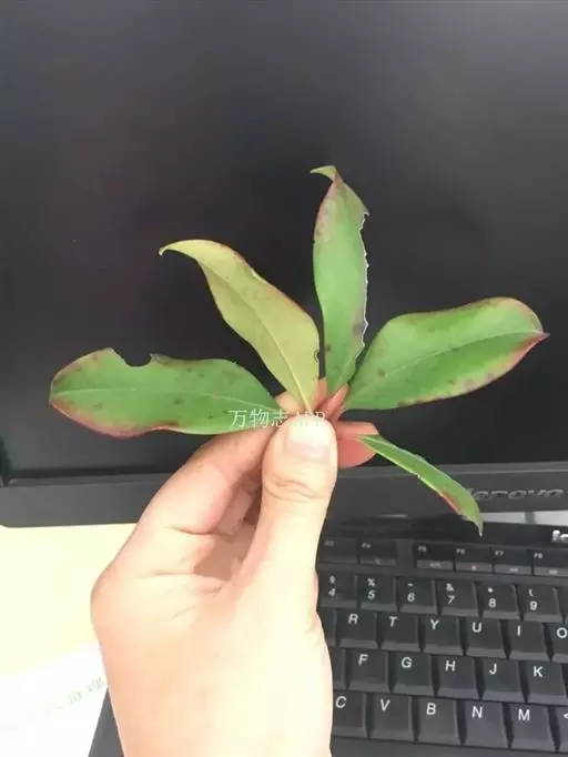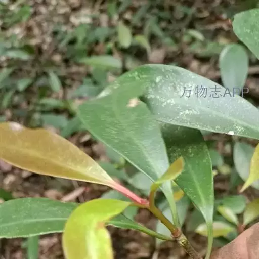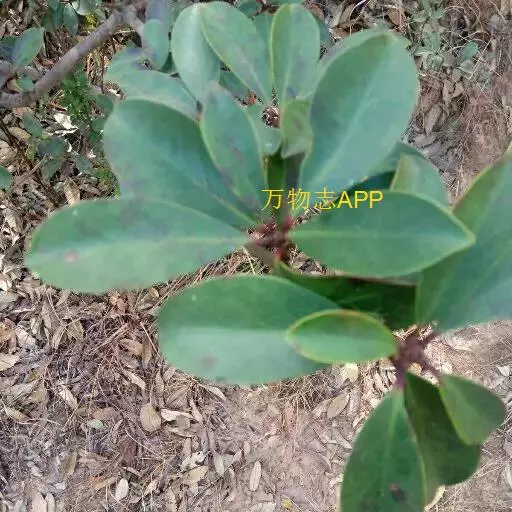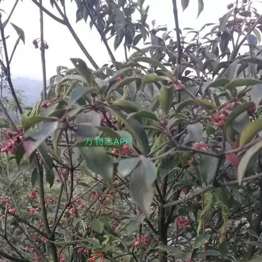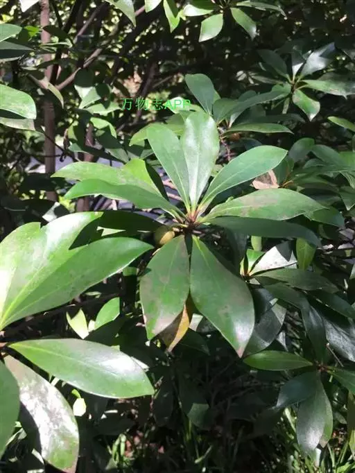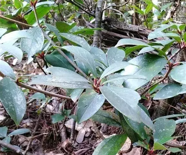 叶革质或薄革质,通常聚生于枝端,互生,叶片椭圆形、椭圆状倒卵形至长圆状倒卵形,长5.5-9厘米,宽2-3.5厘米,顶端短渐尖或急窄缩成短尖,尖头钝,基部楔形,边全缘,稀有上半部疏生浅疏齿,齿尖具黑色小点,上面深绿色或绿色,有光泽,下面浅绿色,干后常呈淡红褐色,中脉在上面稍凹下,在下面隆起,侧脉5-6对,两面均不明显,少有在上面隐约可见;叶柄长7-13毫米。