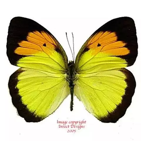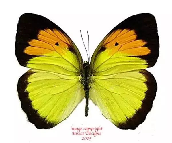 雌雄异型。雄蝶有2种形态,一种前翅正面端半部黑色,基半部为黄色,中域为大型橙色斑,中室端有黑斑,后翅黄色,外线黑带窄;另一种中室端为橙黄色斜带。