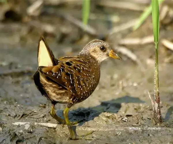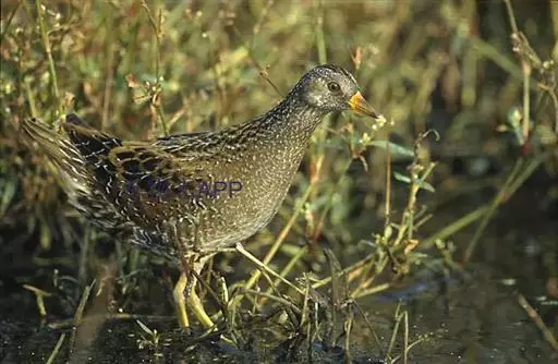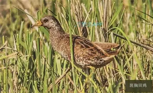 斑胸田鸡(学名:Porzana porzana)是鹤形目秧鸡科的鸟类,小型涉禽,体长约23厘米,嘴粗短,跗蹠较中趾连爪长度为短。第2枚初级飞羽最长,并与第3枚初级飞羽几等长。第1枚初级飞羽约与第6枚或第7枚等长。色深,嘴短,上体橄榄褐色,具黑色粗条纹和白色斑点。下体橄榄灰色,具白色斑点,两胁灰色有白色横斑纹,尾下覆羽皮黄色。栖于湿润草地及稻田。黄昏及入夜后发出持久而重复有律的鞭响型哨音。繁殖于欧洲,往东到中亚和中西伯利亚以及中国新疆西部;越冬在欧洲南部、非洲、印度和缅甸,偶尔见于至泰国。