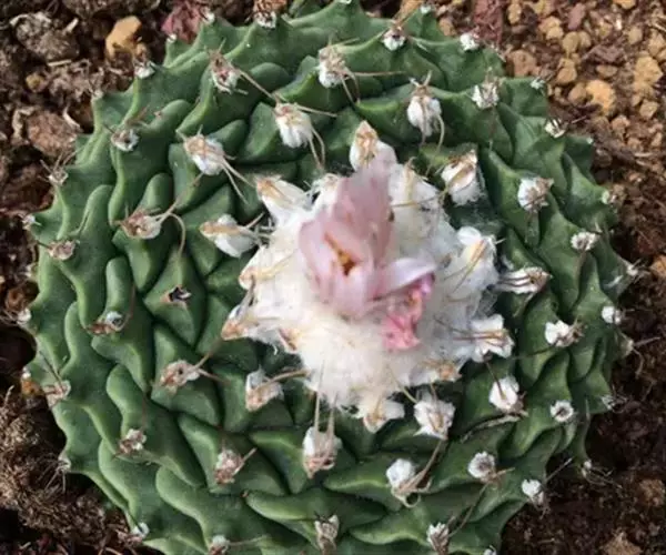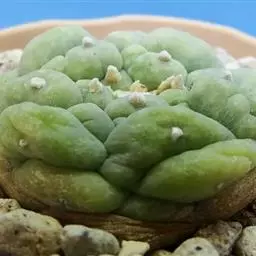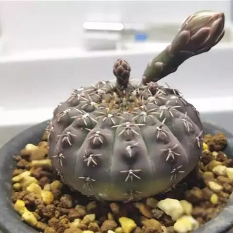 帝冠植株单生,属小型种,根粗大,变态茎形如陀螺,瘤状突起呈三角形,坚硬,呈几何形有序排列,非常特殊,是仙人掌植物中的代表种;盆栽帝冠可点缀窗台、书桌和案头,作为小摆设,是很难得的仙人掌类珍品。