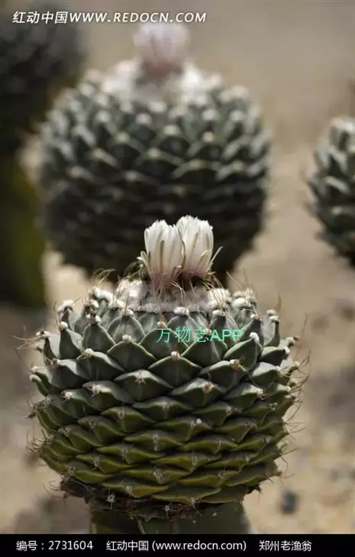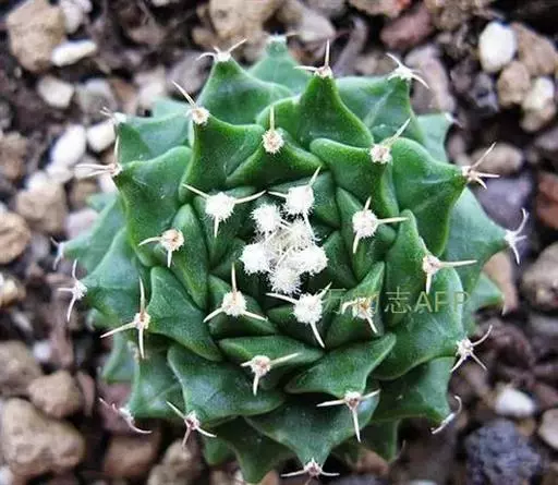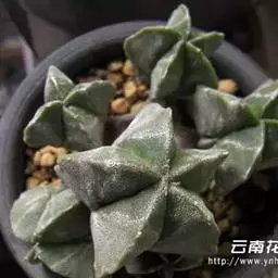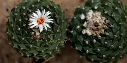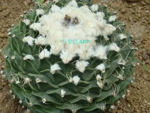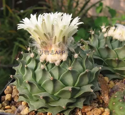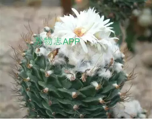 灰绿色三角形叶状疣突在茎部螺旋排列成莲座状,疣突背面有龙骨突。疣基部宽1.5~2.5cm,长1~1.5cm,肉质坚硬,刺座在疣突顶端,新刺座上有短绵毛,一般刺座长有刺2~4枚,刺较小,长1~1.5cm,刺细针状稍内弯,黄白色,早落。老株刺更易脱落,球体下部的疣状突起也易枯萎或脱落,形成树皮状的皱纹。花顶生,短漏斗状,花