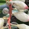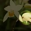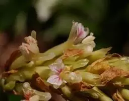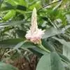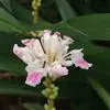 总状花序在花蕾时全部包藏于一帽状总苞片中,花时整个脱落,花序轴被极短的柔毛;小花梗长1-2毫米;大苞片极短,膜质,棕色;花萼筒状,长1.2厘米,一侧开裂至中部,先端具3齿裂,外被短柔毛;花冠管长8-10毫米,花冠裂片长圆形,长约1.8厘米,后方的1枚稍大,白色,外被疏柔毛;侧生退化雄蕊钻状,长约2毫米;唇瓣倒卵形,长约2厘米,粉白色而具红色脉纹,先端边缘皱波状;花丝长1.2厘米,花药长约7毫米;子房密被绒毛。