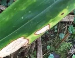 叶枯病:老叶先发病,病菌多从叶尖、叶缘侵入。防治方法:①清除落叶,适当遮荫;②用1∶1∶100 倍波尔多液喷洒;③每亩80%二澳氯丙烷乳剂3千克对水100千克,开沟施下,覆土。