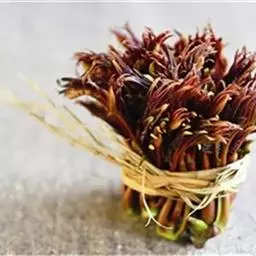 香椿芽在合适的温度条件下(白天18℃~24℃、晚上12℃~14℃),生长快,呈紫红色,香味浓。温室加盖草苫后40~50天,当香椿芽长到15~20厘米,而且着色良好时开始采收。第一茬椿芽要摘取丛生在芽薹上的顶芽,采摘时要稍留芽薹而把顶芽采下,让留下的芽薹基部继续分生叶片。采收宜在早晚进行。温室里香椿芽每隔7~10天可采1次,共采4~5次,每次采芽后要追肥浇水。