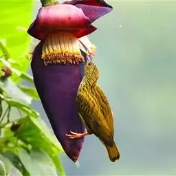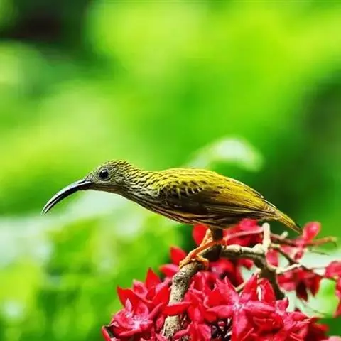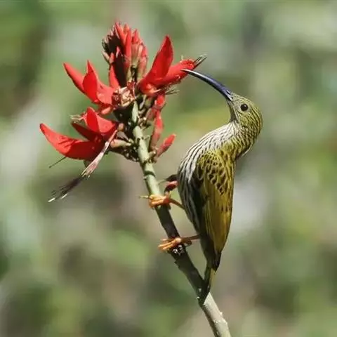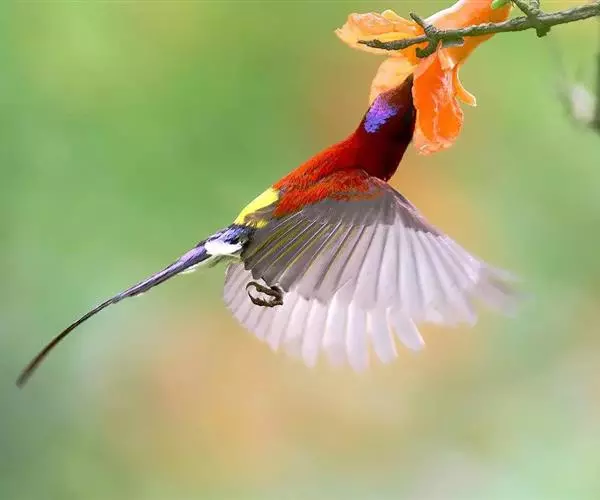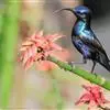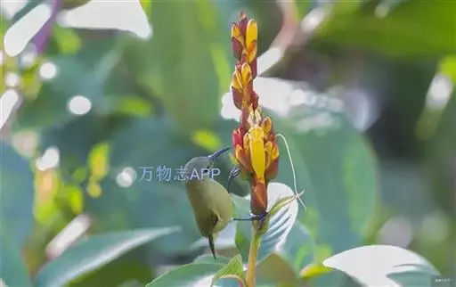 太阳鸟有细长微弯的嘴和管状的长舌,和蜂鸟一样以吸食花蜜为生。但遇到小甲虫和蜘蛛,也不放过开荤的机会,抓来充饥。它还是带翅膀的“月下老人”,为植物传授花粉。