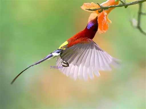 鉴别特征 雄鸟头顶辉蓝;背和特形延长的中央尾羽火红色;颏、喉紫蓝,并具金属反光;胸部桔红;下体余部黄绿。雌鸟上体橄榄黄,下体黄绿色 。