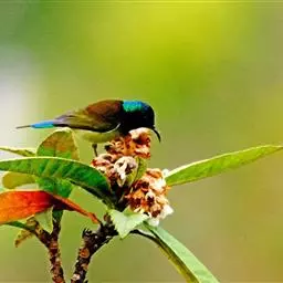 太阳鸟体重仅5~6克,连尾羽在内,最大的身长不超过15厘米。每当太阳初升,霞光映照,或者雨过天晴,万里蓝天的时候,太阳鸟和蝴蝶、蜜蜂等在万紫千红的百花丛中,成群飞翔。它们那鲜艳的羽 太阳鸟 衣,闪现红、黄、蓝、绿等耀眼的光泽,夺目异常,故名“太阳鸟”。当它们不停地挥动着短圆的小翅膀,轻捷地将长长的嘴,伸进花蕊深处吸食花蜜时,那悬停半空,倒吊身子的高难动作,简直和美洲的蜂鸟一模一样。所以,有人把它誉为“东方的蜂鸟”。 每年春季,是太阳鸟的繁殖季节。这时,双双对对,在森林边缘或沟谷坡地的灌木丛间筑巢。巢呈梨形,悬挂枝头,随风摆动。每巢产卵2~3枚,卵壳呈乳白色,间有细小的棕色斑点。