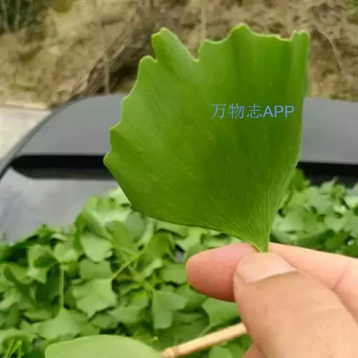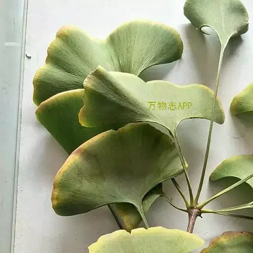 叶互生,在长枝上辐射状散生,在短枝上3~5枚成簇生状,有细长的叶柄,扇形,两面淡绿色,无毛,有多数叉状并列细脉,在宽阔的顶缘多少具缺刻或2裂,宽5-8(-15)厘米,具多数叉状并歹帕细脉。在长枝上散生,在短枝上簇生。它的叶脉形式为“二歧状分叉叶脉”。在长枝上常2裂,基部宽楔形,柄长3-10(多为5~8)厘米,幼树及萌生枝上的叶常较而深裂(叶片长达13厘米,宽15厘米),有时裂片再分裂(这与较原始的化石种类之叶相似),叶在一年生长枝上螺旋状散生,在短枝上3-8叶呈簇生状,秋季落叶前变为黄色。