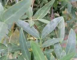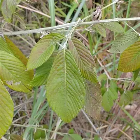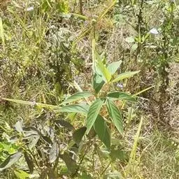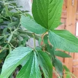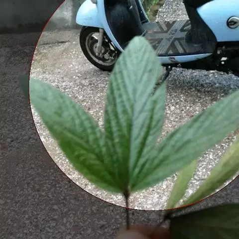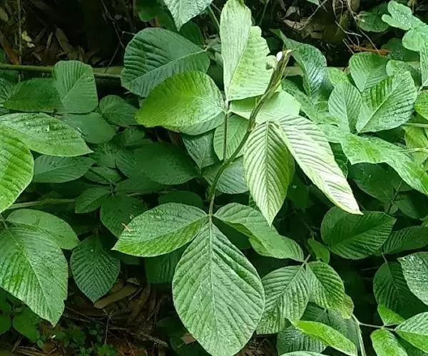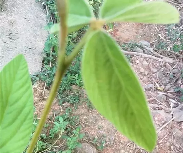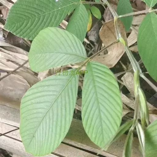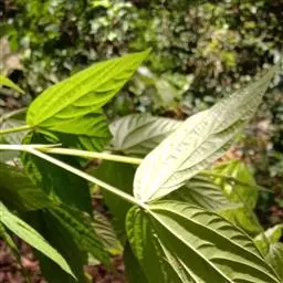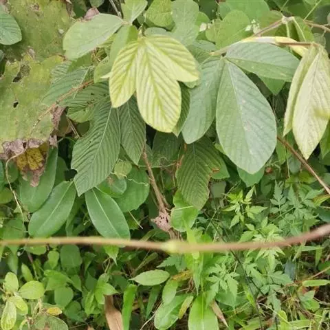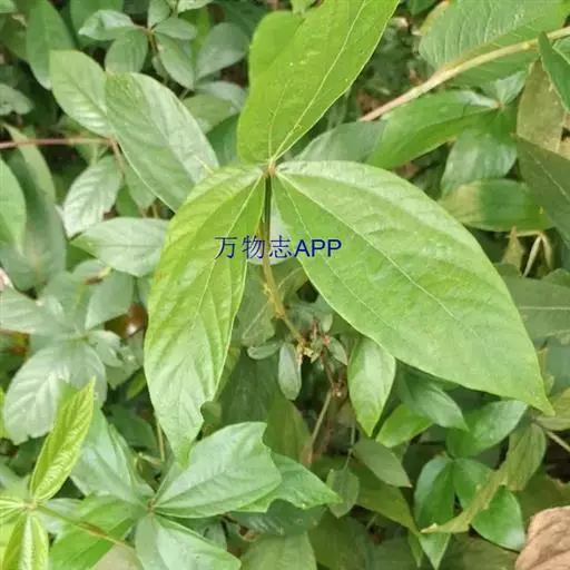 叶具指状3小叶:托叶大,披针形,长可达2厘米,先端长尖,被短柔毛,具腺纹,常早落;叶柄长3-6厘米,具狭翅,被毛与幼枝同;小叶纸质或薄革质,顶生小叶宽披针形至椭圆形,长8-15厘米,宽4-7厘米,先端渐尖,基部楔形;基出脉3,两面除沿脉上被紧贴的柔毛外,通常无毛,下面被黑褐色小腺点,侧生小叶稍小,偏斜,基部一侧圆形,另一侧楔形;基出脉2-3;小叶柄长2-5毫米,密被毛。