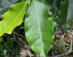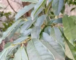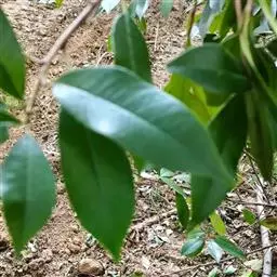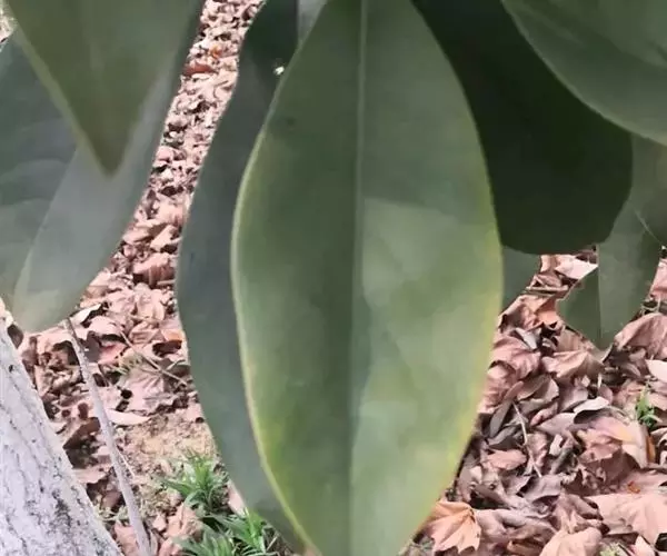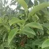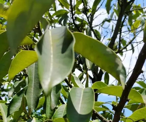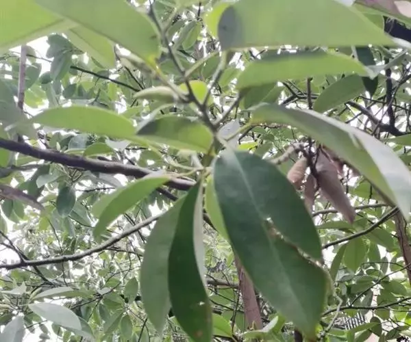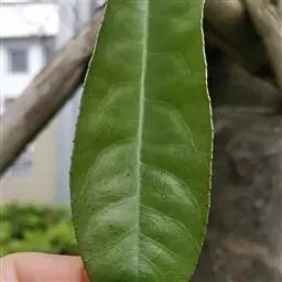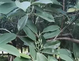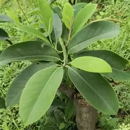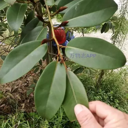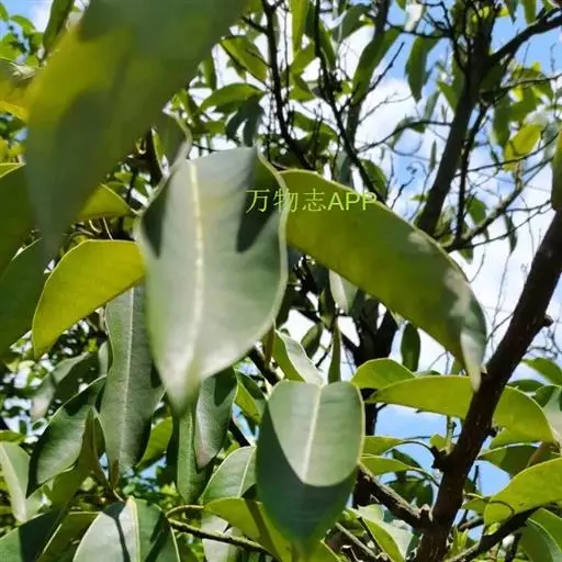 叶互生,革质深绿色,叶背淡绿色,长圆状椭圆形,很少卵状椭圆形,长7-18厘米,宽3.5-8.5厘米,先端骤狭短渐尖或短渐尖而尖头钝,基部楔形,阔楔形或近圆钝,上面深绿色,有光泽,下面灰绿色,被白粉,侧脉每边7-12条,直或稍曲,至近叶缘开叉网结、网眼致密。叶柄长1-3厘米,无托叶痕。