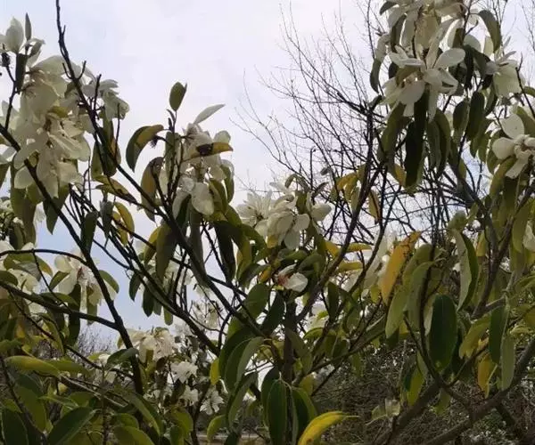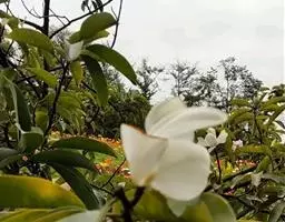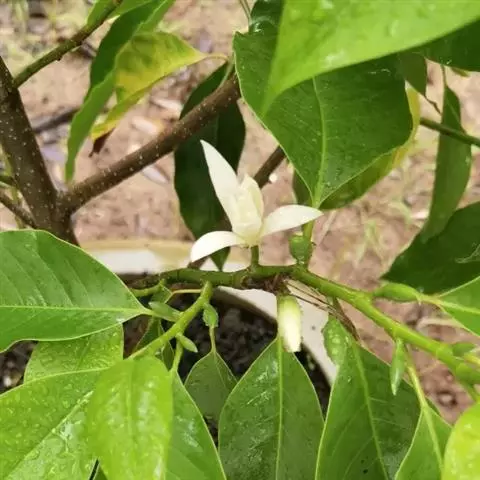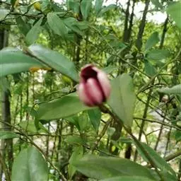 深山含笑的花 常绿乔木,高达20米,各部均无毛;树皮薄、浅灰色或灰褐色平滑不裂;芽、嫩枝、叶下面、苞片均被白粉。