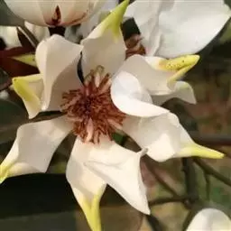 花梗绿色具3环状苞片脱落痕,佛焰苞状苞片淡褐色,薄革质,长约3厘米;花芳香,花被片9片,纯白色,基部稍呈淡红色,外轮的倒卵形,长5-7厘米,宽3.5-4厘米,顶端具短急尖,基部具长约1厘米的爪,内两轮则渐狭小;近匙形,顶端尖;雄蕊长 深山含笑的幼果 1.5-2.2厘米,药隔伸出长1-2毫米的尖头,花丝宽扁,淡紫色,长约4毫米;雌蕊群长1.5-1.8厘米;雌蕊群柄长5-8毫米。心皮绿色,狭卵圆形、连花柱长5-6毫米。