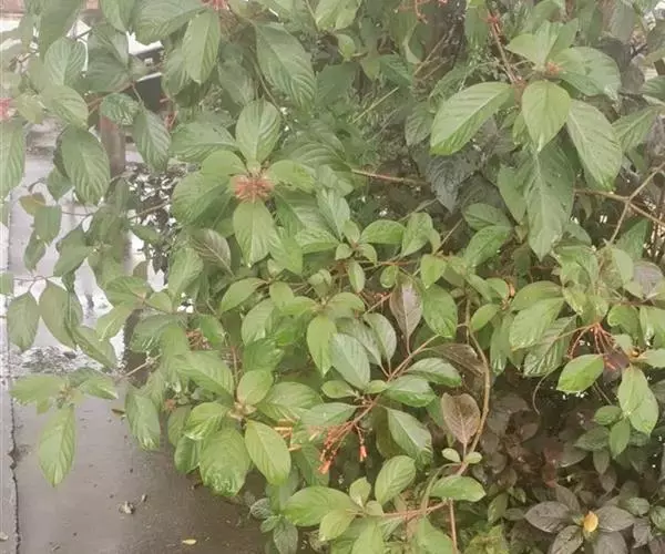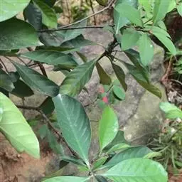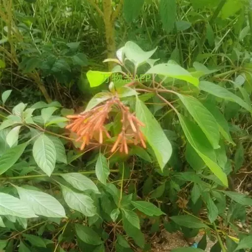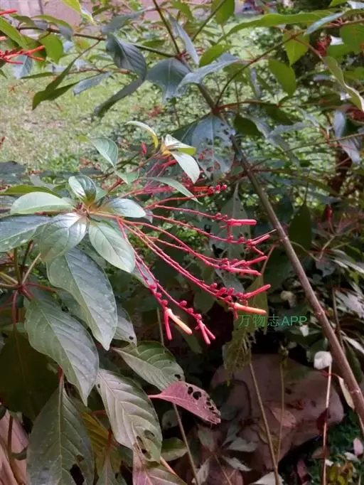 常绿灌木或小乔木,高可达7m;枝开展下垂。叶3~4枚轮生,倒卵状椭圆形至卵形,长5~8(12)cm,侧脉弧形,基部楔形,全缘,两面有毛。花冠红色或橙红色,管状,长达1.8cm,端5裂;成顶生红色聚伞花序。浆果卵球形,长约6mm,暗红或紫色。
