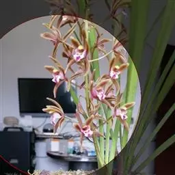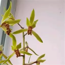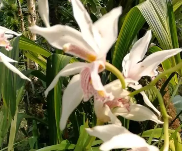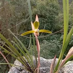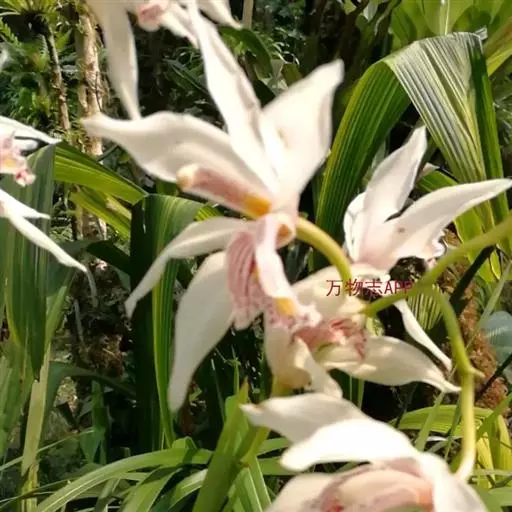 美花兰(学名:Cymbidium insigne Rolfe):地生或附生植物;假鳞茎卵球形至狭卵形,长5-9厘米,宽2.5-4厘米,包藏于叶基之内。叶6-9枚,带形。花葶近直立或外弯,较粗壮;总状花序具4-9朵或更多的花;萼片与花瓣白色或略带淡粉红色,有时基部有红点,唇瓣白色,侧裂片上通常有紫红色斑点和条纹,中裂片中部至基部黄色,亦有少数斑点与斑纹;花瓣狭倒卵形,长2.8-3厘米,宽1-1.2厘米;唇瓣近卵圆形,略短于花瓣,3裂。花期11-12月。