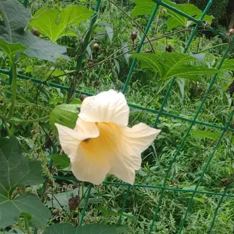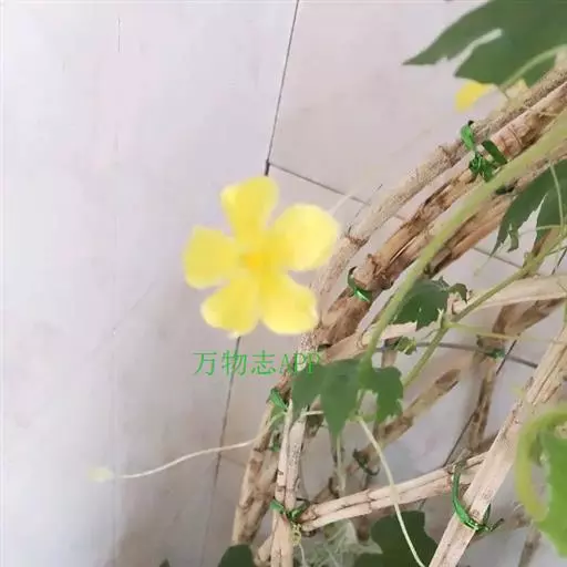 雌雄同株。雄花:单生叶腋,花梗纤细,被微柔毛,长3-7厘米,中部或下部具1苞片;苞片绿色,肾形或圆形,全缘,稍有缘毛,两面被疏柔毛,长、宽均5-15毫米;花萼裂片卵状披针形,被白色柔毛,长4-6毫米,宽2-3毫米,急尖;花冠黄色,裂片倒卵形,先端钝,急尖或微凹,长1.5-2厘米,宽0.8-1.2厘米,被柔毛;雄蕊3,离生,药室2回折曲。雌花:单生,花梗被微柔毛,长10-12厘米,基部常具1苞片;子房纺锤形,密生瘤状突起,柱头3,膨大,2裂。