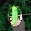 滑身苦瓜 按果实形状和表面特征分为长圆锥形和短圆锥形两类。前者如广东滑身苦瓜、长身苦瓜和长江流域的白苦瓜,果长约20-25厘米,横切面直径约5-6厘米,浓绿色,一般果重0.2-0.3千克,早熟,品质好。后者如广东大顶苦瓜,果长约20厘米,横切面直径约11厘米,顶端圆钝,青绿色,果重0.2-0.6千克,适应性强,品质优良。另外根据果实颜色深浅分为浓绿、绿和绿白等,绿色和浓绿色品种苦味较浓,长江以南栽培较多;淡绿或绿白色品种苦味较淡,长江以北栽培较多。