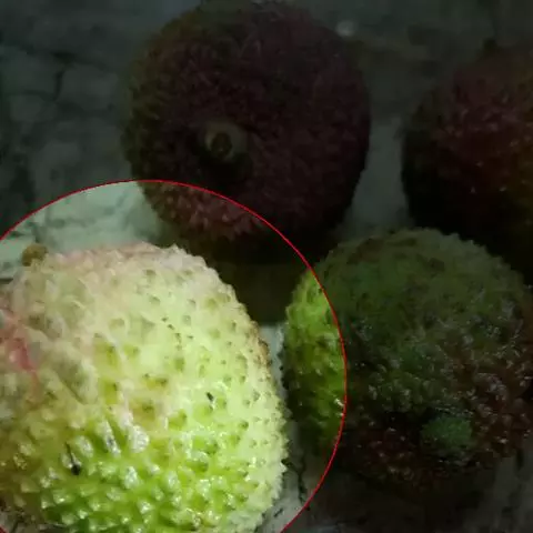 果实纺锤形或圆柱形,多瘤皱,长10-20厘米,成熟后橙黄色,由顶端3瓣裂。种子多数,长圆形,具红色假种皮,两端各具3小齿,两面有刻纹,长1.5-2厘米,宽1-1.5厘米。花、果期5-10月。