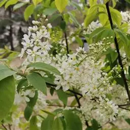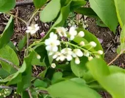 总状花序单生或2-4个簇生于叶腋,长2-6厘米,被短柔毛;花梗长1-3毫米;苞片长2-3毫米,位于花序最下面者常在先端3裂而无花;花直径5-9毫米;花萼外面被短柔毛;萼筒钟形,长约2毫米;萼片卵状三角形,长1-2毫米,先端圆钝;花瓣近圆形,长约为萼片之2倍,白色;雄蕊约20-25,长约4-6毫米;子房无毛,花柱几与雄蕊等长。果实长圆形或卵状长圆形,长18-24毫米,宽8-11毫米,顶端急尖并具短尖头;黑褐色,无毛,核壁表面稍具网纹。花期7-10月,果期冬季。