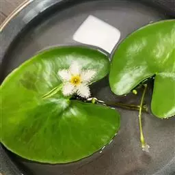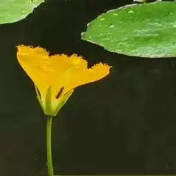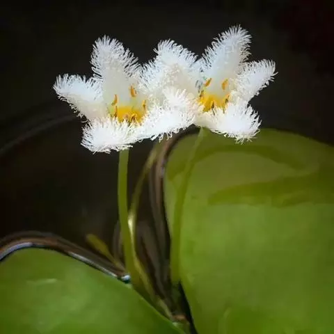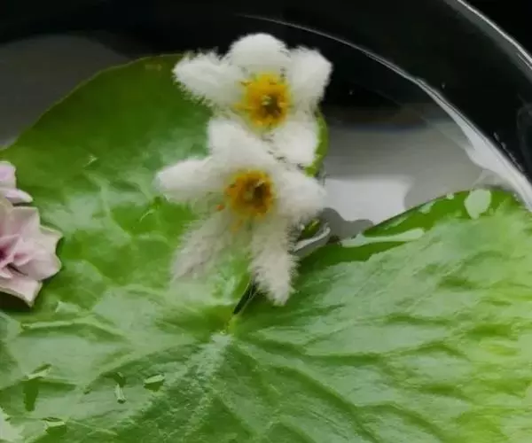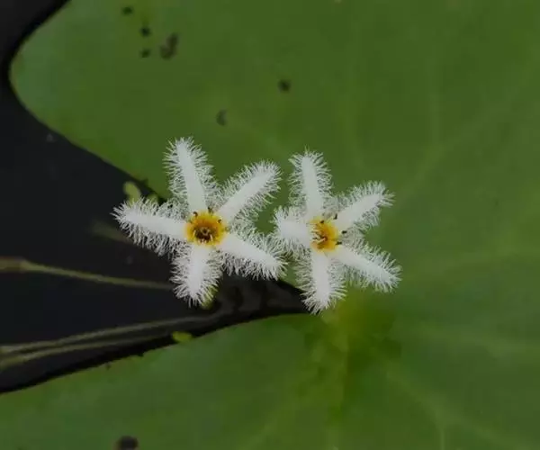 金银莲花(学名:Nymphoides indica (L.) O. Kuntze):多年生水生草本。茎圆柱形,不分枝,形似叶柄,顶生单叶。叶飘浮,近革质,宽卵圆形或近圆形,下面密生腺体,基部心形,全缘,具不甚明显的掌状叶脉,叶柄短,圆柱形,花多数,簇生节上,花梗细弱,圆柱形,不等长,分裂至近基部,裂片长椭圆形至披针形,先端钝,脉不明显;花冠白色,基部黄色,分裂至近基部,冠筒短,裂片卵状椭圆形,先端钝,腹面密生流苏状长柔毛。蒴果椭圆形,花果期8-10月。