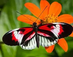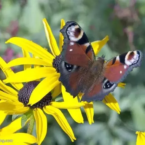 孔雀蛱蝶展翅宽50~60mm。翅膀表面红色,上、下翅有一大型彩色眼纹;翅膀腹面淡褐色,拟似烟熏枯叶…