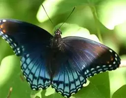 雌性明显较大。翅表深蓝色,有光泽。前翅外缘有 1 列小白点,亚外缘 线和外横线由相互套叠的“<”纹构成,中带的白纹上方长形,下方为点状,中室有蓝白纹;后翅外缘有 1 列白点,亚外缘有 1 列“<”形白纹,翅内侧还布有星点状蓝白点。翅里黑色,斑纹同翅表。浙江一年发生三代,以蛹越冬。