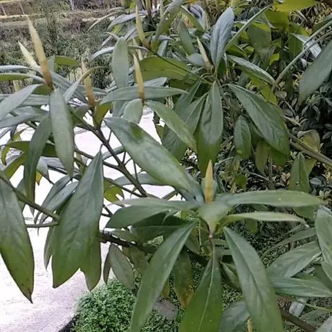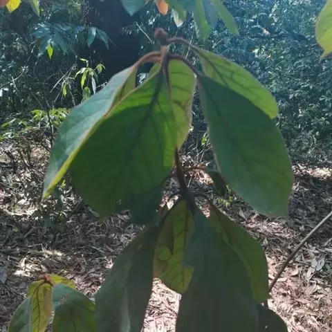常绿大乔木,高达30余米,胸径1米;幼枝有棱,被黄褐色或灰褐色柔毛,2年生枝黑褐色,无毛。叶长圆形,长圆状倒披针形或窄椭圆形,长5一11厘米,宽1.5一4厘米,先端渐尖,基部楔形,上面有光泽,中脉上被柔毛,下面被短柔毛,侧脉约14对;叶柄纤细,初被黄褐色柔毛。圆锥花序腋生,被短柔毛,长4-9厘米;花被裂片6,椭圆形,近等大,两面被柔毛;发育雄蕊9枚,被柔毛,花药4室,第3轮的花丝基部各具1对无柄腺体,退化雄蕊长约1毫米,被柔毛,三角形;雌蕊无毛,长2毫米,子房近球形,花柱约与子房等长,柱头膨大。果序被毛;核果椭圆形或椭圆状卵圆形,成熟时黑色,长约13厘米,花被裂片宿存,紧贴果实基部。