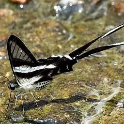 长尾麝凤蝶是凤蝶科、麝凤蝶属蝴蝶。翅黑色或黑褐色,前翅脉纹两侧灰色或黄褐色。后翅外缘波状,…