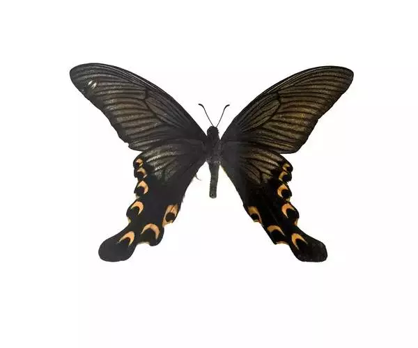 成虫:翅展105—122mm。 体、翅黑色,脉纹两侧色淡或呈灰白色。后翅外缘波状,在波谷有红色斑纹,在外缘区各翅室有倒“U”字形红斑纹,尾突特宽大且有“V”字形斑纹,臀角有环形红色斑纹,中室及其周围白色。翅反面与正面相似。