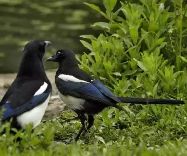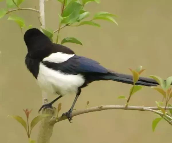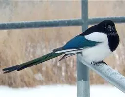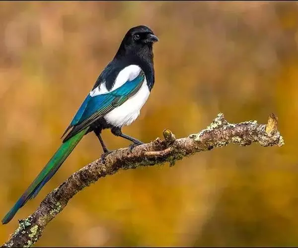喜鹊(学名:Pica pica)是鸟纲鸦科的一种鸟类。共有10个亚种。体长40-50厘米,雌雄羽色相似,头、颈、背至尾均为黑色,并自前往后分别呈现紫色、绿蓝色、绿色等光泽,双翅黑色而在翼肩有一大形白斑,尾远较翅长,呈楔形,嘴、腿、脚纯黑色,腹面以胸为界,前黑后白。留鸟。