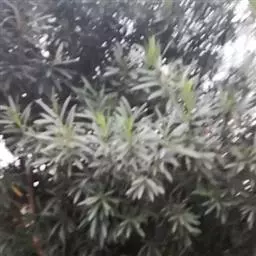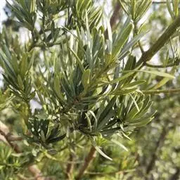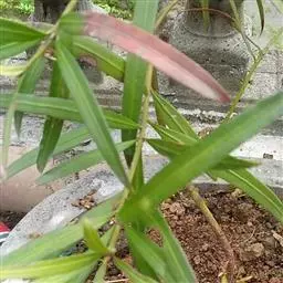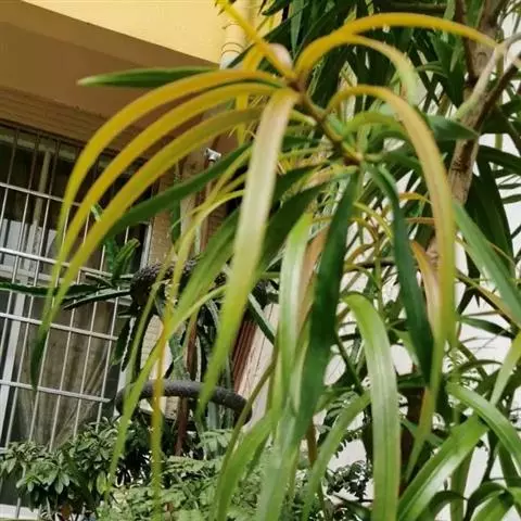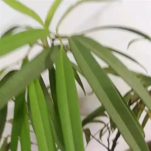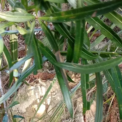 叶常密生枝条的上部,叶间距离极短,革质或薄革质,斜展,窄椭圆形、窄矩圆形或披针状椭圆形,长 1.5~4 公分,宽 0.3~0.8 公分(幼树或萌芽枝的叶长达 5.5 公分,宽 1.1 公分,先端钝,有突起的小尖头),上面绿色,有光泽,中脉隆起,下面色淡,干后淡褐色,中脉微隆起,伸至叶尖,边缘微向下卷曲,先端微尖或钝,基部健窄,叶柄极短,长 0.15~0.4 公分。