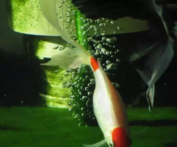 ②绿水饲养。每当鹤顶红、鹅头红的鱼卵孵出后,10~15天第一次换水(脱水)时,可适当用一点鱼苗缸中的老水,不要全部用新水。这以后,饲养幼鱼的水不要用白水,一定要养在嫩绿水或绿色水中。即使幼鱼长到2厘米左右(特别是在将要变色前后阶段70~81天时),也不要经常把它们放在无色的白水中饲养。这样也许在某种程度上可促使幼鱼头顶红色肉瘤中黄色素细胞的分裂和发育生长。