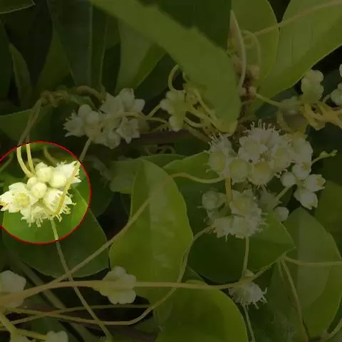南方菟丝子(学名:Cuscuta australis R. Br.),为旋花科、菟丝子属的一年生寄生草本。茎缠绕,金黄色,纤细,无叶。花序侧生,少花或多花簇生成小伞形或小团伞花序,总花序梗近无;苞片及小苞片均小,鳞片状;花梗稍粗壮;花萼杯状,基部连合,长圆形或近圆形;花冠乳白色或淡黄色,杯状,顶端圆,宿存;雄蕊着生于花冠裂片弯缺处,比花冠裂片稍短;鳞片小,边缘短流苏状;子房扁球形,柱头球形。蒴果扁球形,下半部为宿存花冠所包,成熟时不规则开裂,不为周裂。通常有4种子,淡褐色,卵形,表面粗糙。