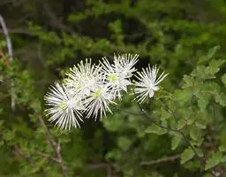 圆锥花序顶生或生于侧枝顶,长6-25厘米,被贴生柔毛,花序轴常为“之”字形屈曲;苞片1个,线状披针形,长4-6毫米,被柔毛;小苞片线形,长1-2毫米;花多数,直径6-8毫米;萼片5个,离生,宿存,广卵形,大小不相等,长4-5毫米,先端钝,无毛或偶有疏毛,边缘有睫毛;花瓣通常3个,白色,卵圆形,约与萼片等长;雄蕊多数,比萼片稍短,花丝线形,干后黑色,花药“八”字形排在膨大药隔上,干后灰色;心皮1个,无毛,花柱突出雄蕊之外。