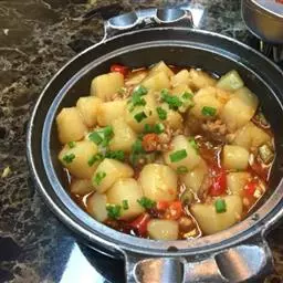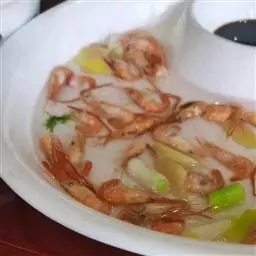 2、坐锅点火倒入油,下姜末、海米煸炒片刻,放入丝瓜,倒适量清水,加糖、鸡精、盐调味,放入粉丝大火烧开,待粉丝熟后和丝瓜一起捞出放在盘中,锅中留原汤,放入柿子椒、虾仁烫熟,和汤一起浇在粉丝上即可;