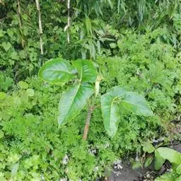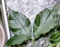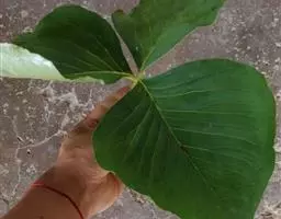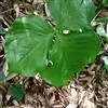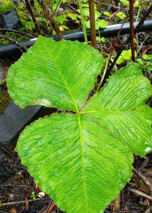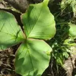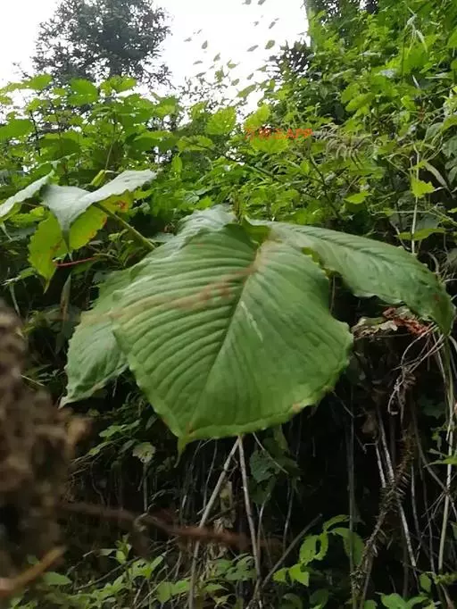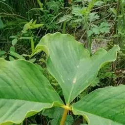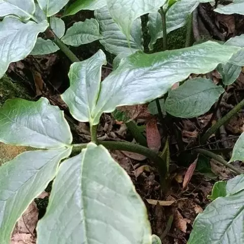 块茎近球形,直径3-5厘米,密生长达10余厘米的纤维状须根。鳞叶3-4,内面2片狭长三角形,长9-15厘米,基部展开宽可达5厘米,绿色或紫色。叶1,叶柄长20-30厘米,黄绿色,基部粗可达2厘米,无鞘,光滑或多少具疣状突起;叶片3全裂,稀3深裂,裂片具0.5-1厘米的柄或无柄,稀基部联合,干时二面黄绿色,中肋背面明显隆起,侧脉斜伸,向边缘远离,脉距1-2厘米,集合脉距边缘0.5-1.5厘米,网脉明显;中裂片倒心形,顶部平截,中央下凹,具正三角形的尖头,向基部渐狭,宽远胜于长,长(5-)9-9.5厘米(包括5-10毫米长的尖头),宽(6-)10.5-12.5厘米;侧裂片较大,长6.5-13厘米。宽(5.5-)11-13厘米,宽斜卵形,骤狭短渐尖,外侧宽,基部圆形,内侧楔形或圆形。