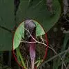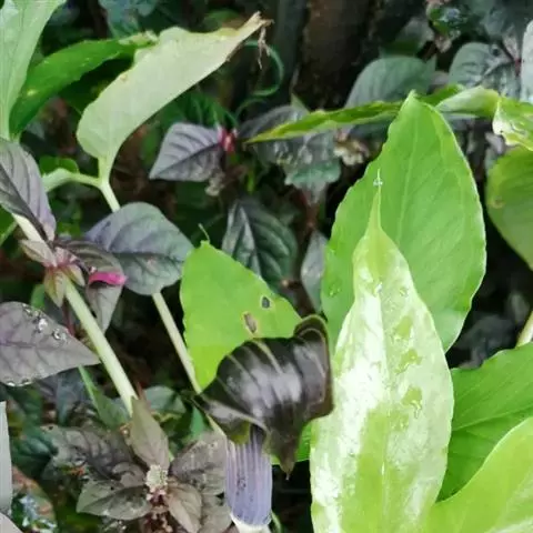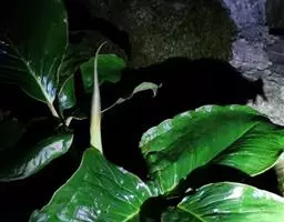 花序柄短于叶柄,长9-25厘米,粗3-5毫米,绿色或淡紫色,具细疣状凸起或否。佛焰苞青紫色,基部黄绿色,管部具白色条纹,向上隐失,上部全为深紫色,管部圆柱形,长2.4-6.5厘米,粗1.8-2.6厘米,喉部边缘斜截形,两侧下缘相交成直角;檐部长圆披针形,长4.5-10厘米,宽3-3.5厘米,由基部稍内弯,先端骤狭渐尖。肉穗花序单性,雄花序长1.5-3厘米,花序轴粗可达8毫米,连花粗1.5厘米,花疏,附属器基部略细成柄状,或几无柄,中部以上渐细,最后成线形,从佛焰苞喉部附近下弯,然后之字形上升或弯转360度后上升或蜿蜒下垂;雌花序长1-2.5厘米,下部粗1.2厘米,附属器基部骤然扩大至5-7毫米,具长5-10毫米的柄,余同雄序附属器。雄花具长柄,柄长2.2-2.5毫米,花药2-5,药室顶部滆合,马蹄形开裂;雌花:子房长卵圆形,先端渐狭为短的花柱,柱头盘状,密被短绒毛,1室,胚珠多数(6-10)。